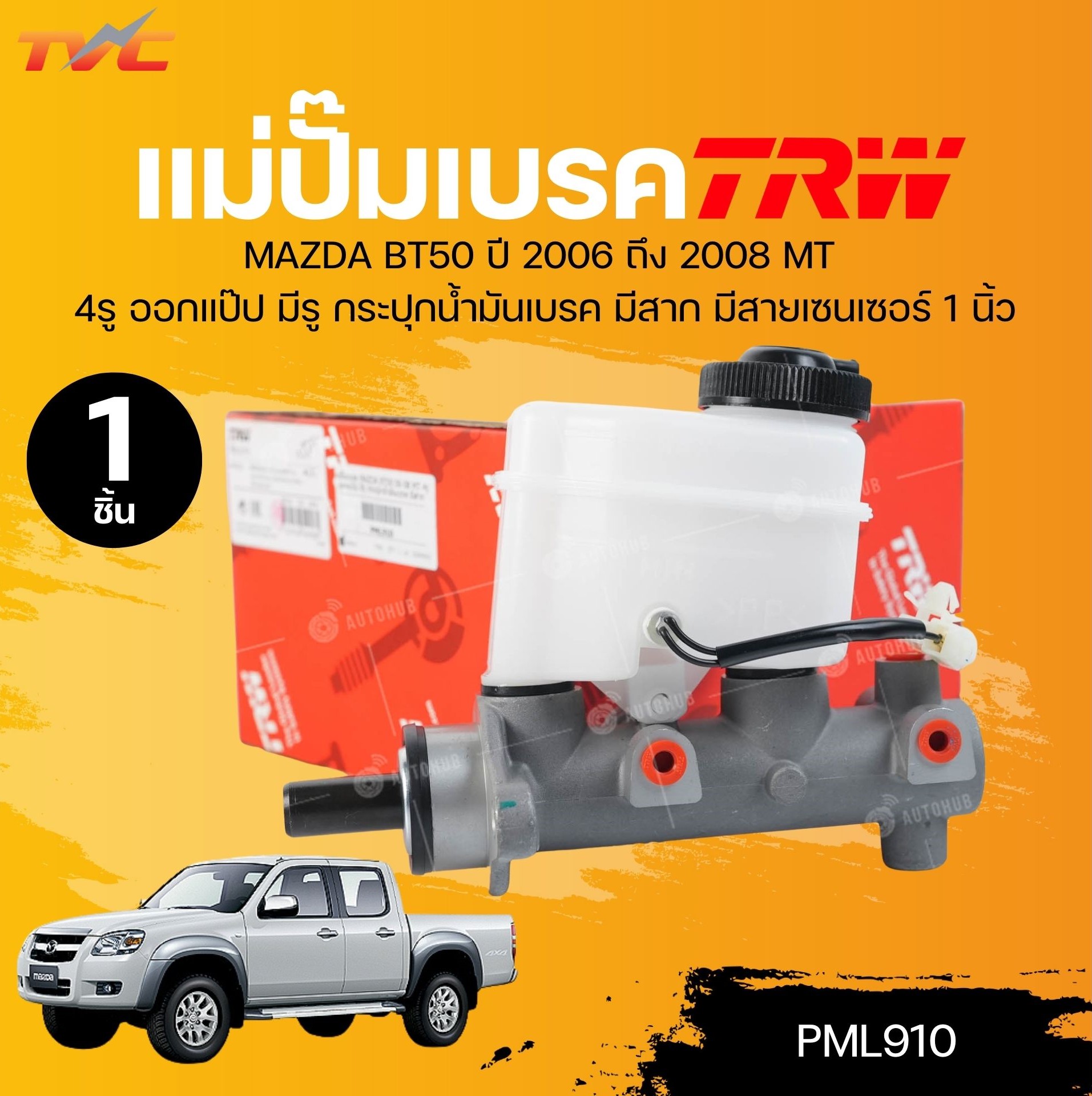TRW แม่ปั๊มเบรค MAZDA MAZDA BT50 2006-2008 MT 4รู ออกแป๊ป มีรู กระปุกน้ำมันเบรค มีสาก มีสายเซนเซอร์ 1 นิ้ว